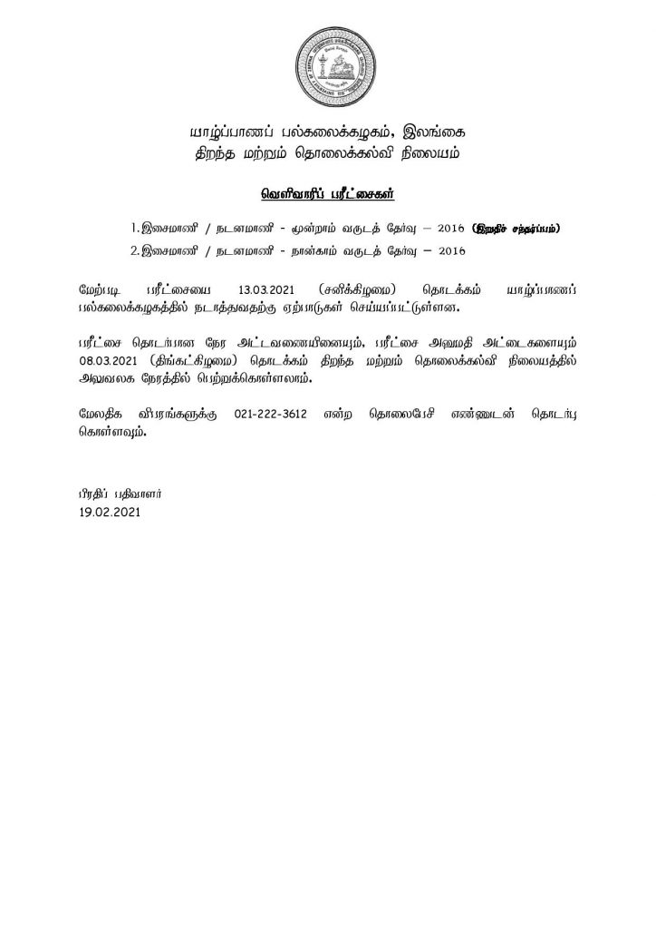 1. இசைமாணி / நடனமாணி – மூன்றாம் வருடத் தேர்வு – 2016 (இறுதிச் சந்தர்ப்பம்)