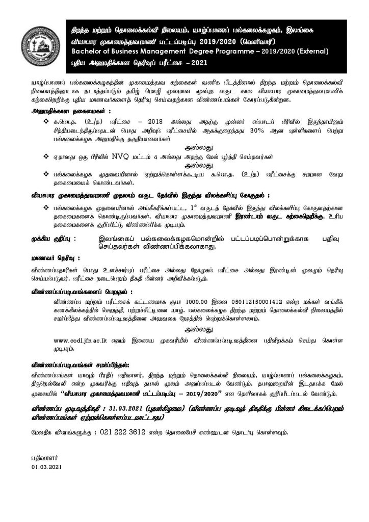 புதிய அனுமதிக்கான தெரிவுப் பரீட்சை – 2021 வியாபார முகாமைத்துவமாணி பட்டப்படிப்பு (வெளிவாரி) – 2019/2020 பிரிவு – XI