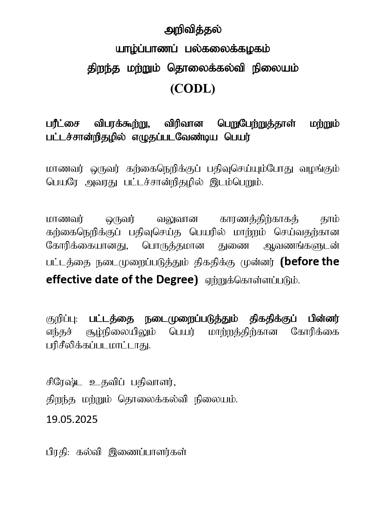 கலைமாணிப்பட்டப்படிப்பு (வெளிவாரி) – பழைய பாடத்திட்டம் – பரீட்சை விண்ணப்பப்படிவம் மற்றும் பரீட்சைக்கான விண்ணப்பத்தினை சமர்ப்பித்தல் வேண்டும்.