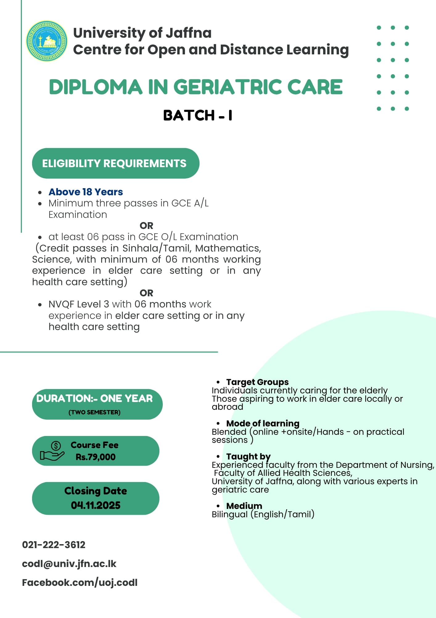 2. Printed google forms along with payment receipt and all educational and Professional certificates should be sent to Deputy Registrar, Centre for Open and Distance Learning, University of Jaffna by registered post on or before 04.11.2025.Please ensure that Diploma in Geriatric Care(Batch – I) is clearly written on the top left – hand corner of the envelop.