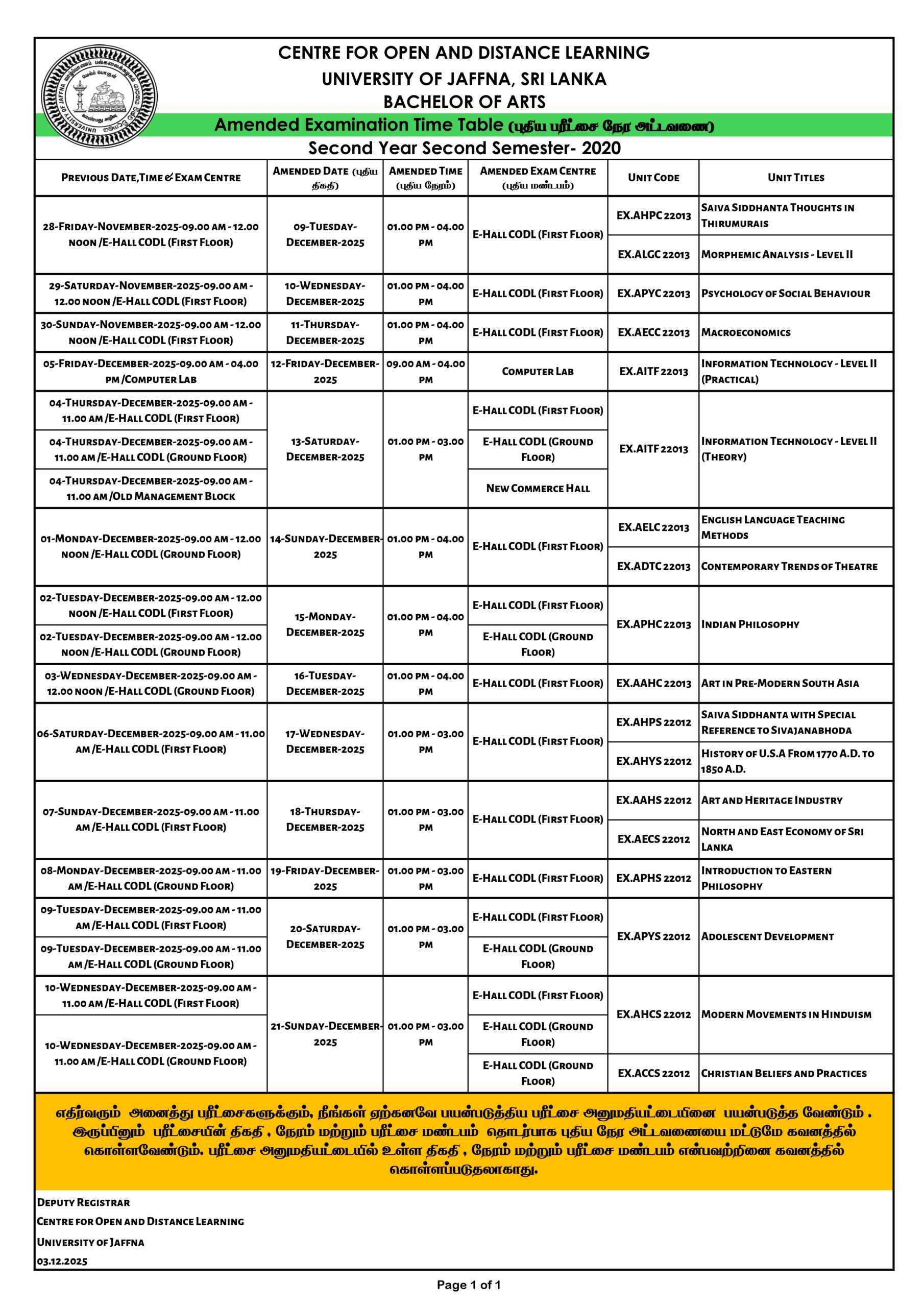 கலைமாணிப்பட்டப்படிப்பு (வெளிவாரி) – புதிய பரீட்சை நேர அட்டவணை – இரண்டாம் வருட இரண்டாம் அரையாண்டு பரீட்சைகள்-2020