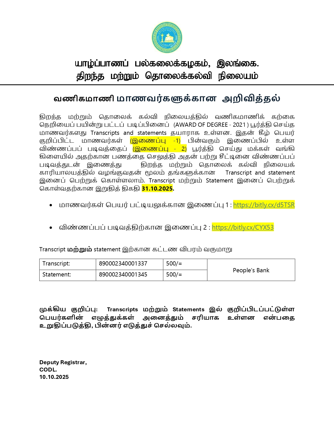 வணிகமாணி மாணவர்களுக்கான அறிவித்தல் Categories Notices Date October 13, 2025 Share: Manager Previous post Examination Timetable - Third Year Second Semester- 2019 - Bachelor of Arts October 13, 2025 Next post யாழ்ப்பாணப் பல்கலைக்கழகம் திறந்த மற்றும் தொலைக்கல்வி நிலையம் ஆண்டுவிழா -2025 : துடுப்பாட்டப்போட்டி October 13, 2025