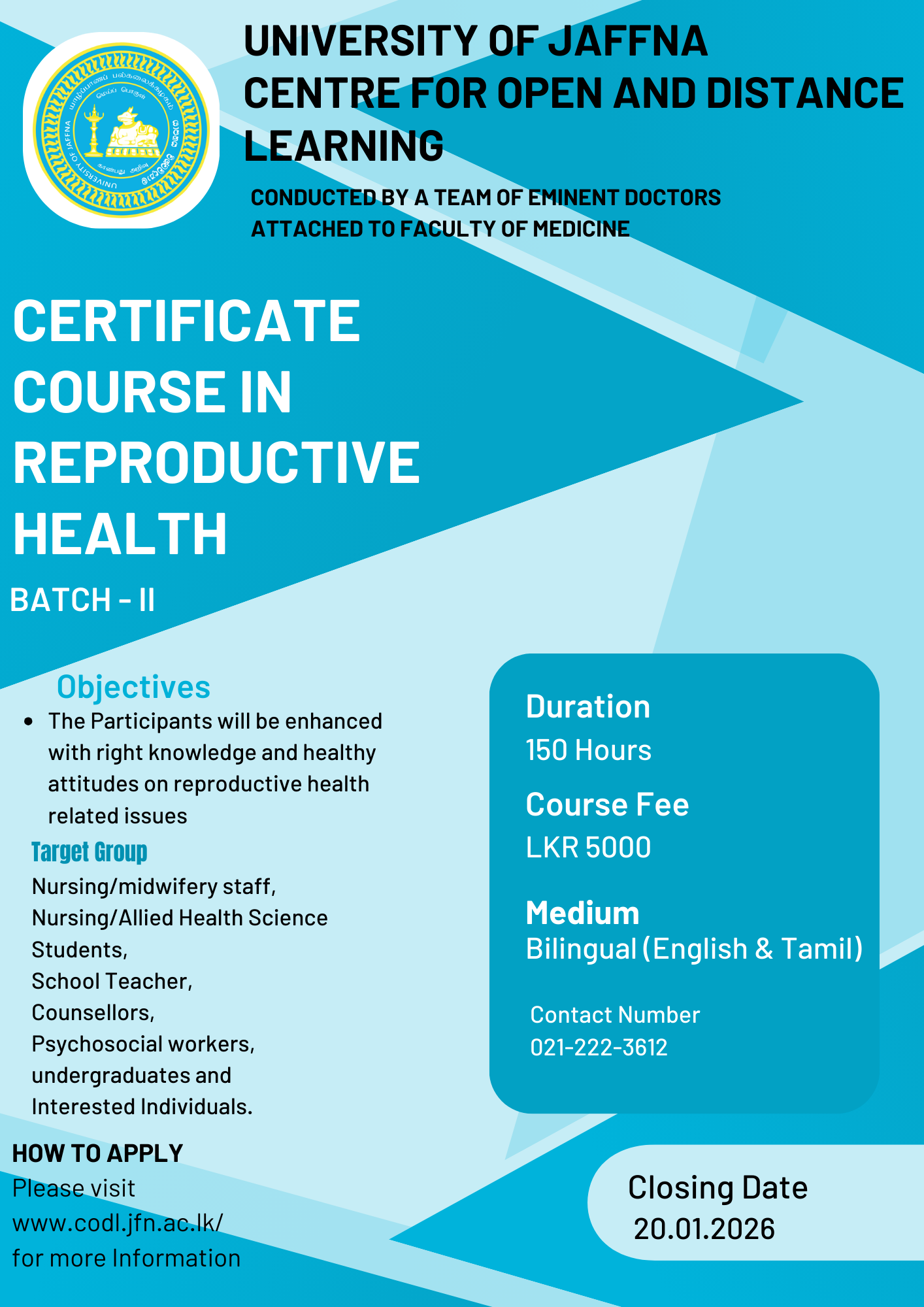 Centre for Open and Distance Learning (CODL), University of Jaffna invites applications from eligible candidates to follow the above course conducted by the Centre for Open and Distance Learning, University of Jaffna.